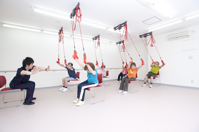 運動指導員は、「レッドコード」というスリングを使用したバランストレーニングや、関節に優しい 空気圧のマシン等による運動で、身体機能の改善を支援します。また、当社が独自に開発した脳活性化プログラム 「シナプソロジー®」を活用し、身体を動かしながら脳を活性化させることで、転倒予防や認知機能の向上を図ります。